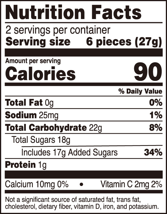 Sugar, starch syrup, water, gelatin, citric acid, less than 2% of: pectin, natural and artificial flavors, calcium carbonate, lemon juice concentrate, sodium citrate, vegetable juice (color), ascorbic acid.
